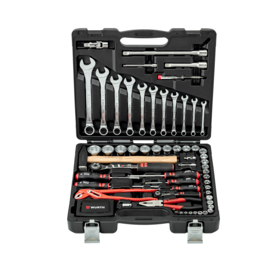 Professioneller 93-teiliger Werkzeugkoffer mit umfassender Grundausstattung für stationäre und mobile Anwendungen. Enthält Schraubendreher, Spannungsprüfer, Schlosserhammer, Zangen sowie 1/2" (SW 10-32mm) und 1/4" (SW 4-14mm) Steckschlüsselsortimente mit Verlängerungen, Kardangelenken und Umschaltknarren. Robuster Kunststoffkoffer mit Hartschaumeinlage für sichere Werkzeugfixierung und schnelle Bestandskontrolle.